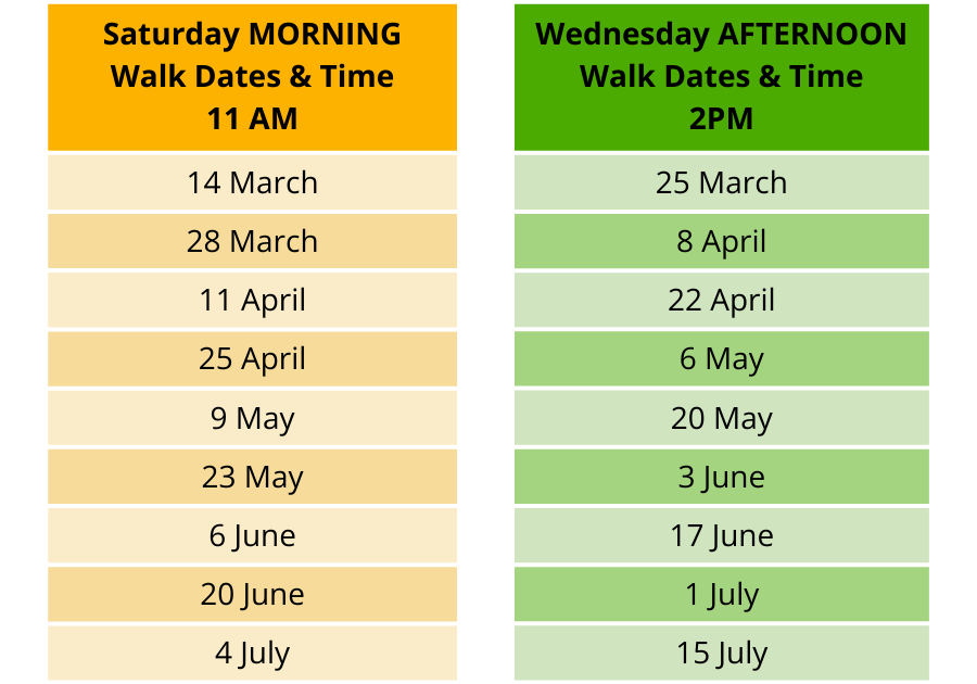 We meet for the Saturday morning walks at 11am for an 11.20am start.